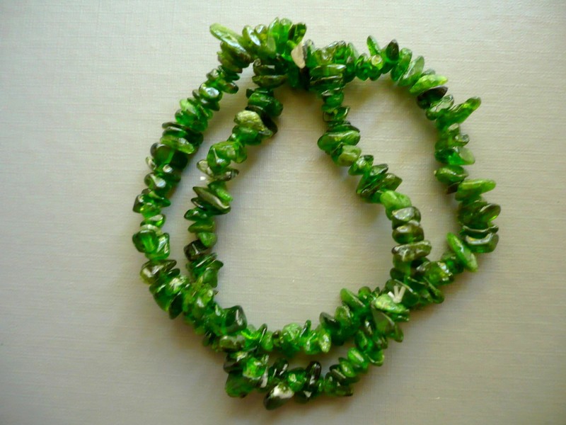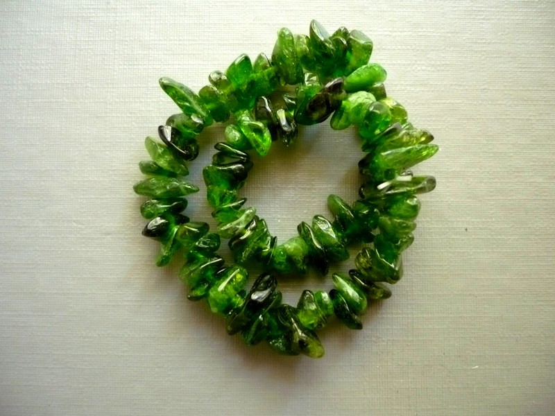 Minerální zlomky chromdiopsidu v délce 20 cm, navlečeno na gumičce. Každý zlomek má svou originální kresbu.