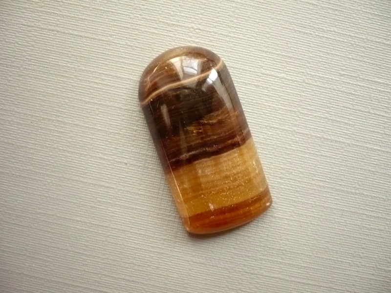 Velký kabošon z hnědého aragonitu výběrové kvality. Rozměry 29 x 14 x 6 mm. Je broušený, leštěný, z jedné strany plochý.