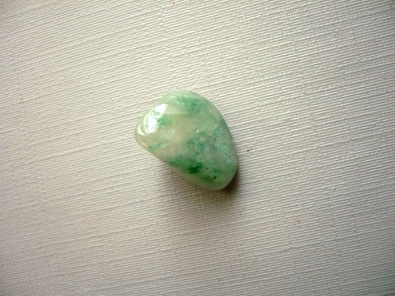 Tromlovaný kámen - chalcedon zelený (mtorolit). Rozměry 16 x 12 x 9 mm. Naleziště Zimbabwe. Chalcedon - povzbuzuje optimismus a dobou vůli, stimuluje schopnost učení. Zahání strach, smutek a deprese.