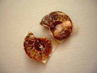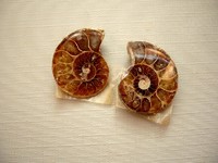 Pár amonitů opalizujících - naleziště Madagaskar. Rozměry jedné půlky 23 x 18 x 5 mm. Půlky jsou z jedné strany leštěné. Tento není poničený, jen mu v procesu zkamenění popraskaly přepážky :-) Amonit - je vlastně zkamenělá schránka živočicha, připomíná beraní rohy. Amonitová schránka je uvnitř rozdělena přepážkami na menší komory, do kterých amonit vylučoval plyn. Tento plyn byl důležitý proto, aby se schránka vznášela ve vodě. Tím jak amonit rostl, tím se také zvětšovaly jednotlivé komory na otevřeném konci. Amonity však vysycháním starověkých moří postupně vymíraly a jejich schránky byly pohlceny v metamorfovaných kamenných masách.