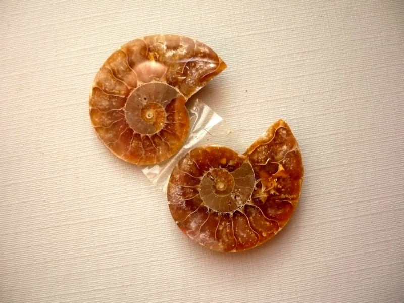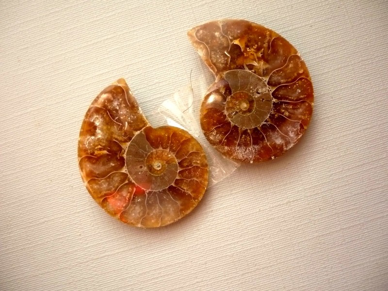 Pár amonitů opalizujících - naleziště Madagaskar. Rozměry jedné půlky 28 x 22 x 4 mm. Půlky jsou z jedné strany leštěné. Tento není poničený, jen mu v procesu zkamenění popraskaly přepážky :-) Amonit - je vlastně zkamenělá schránka živočicha, připomíná beraní rohy. Amonitová schránka je uvnitř rozdělena přepážkami na menší komory, do kterých amonit vylučoval plyn. Tento plyn byl důležitý proto, aby se schránka vznášela ve vodě. Tím jak amonit rostl, tím se také zvětšovaly jednotlivé komory na otevřeném konci. Amonity však vysycháním starověkých moří postupně vymíraly a jejich schránky byly pohlceny v metamorfovaných kamenných masách.