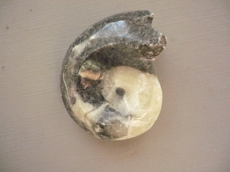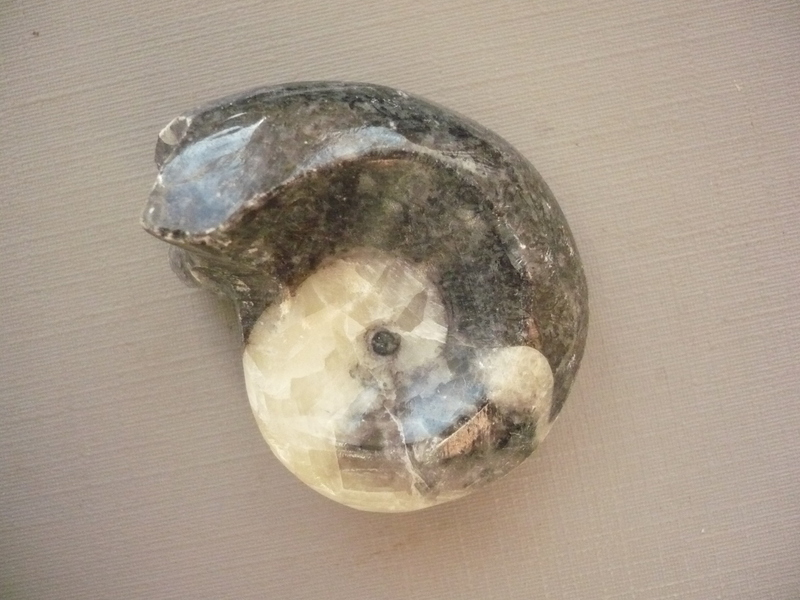 Goniatit - prvohorní fosílie, předchůdce amonitů. Je leštěný z obou stran, původ Maroko. Rozměry 43 x 33 x 18 mm.