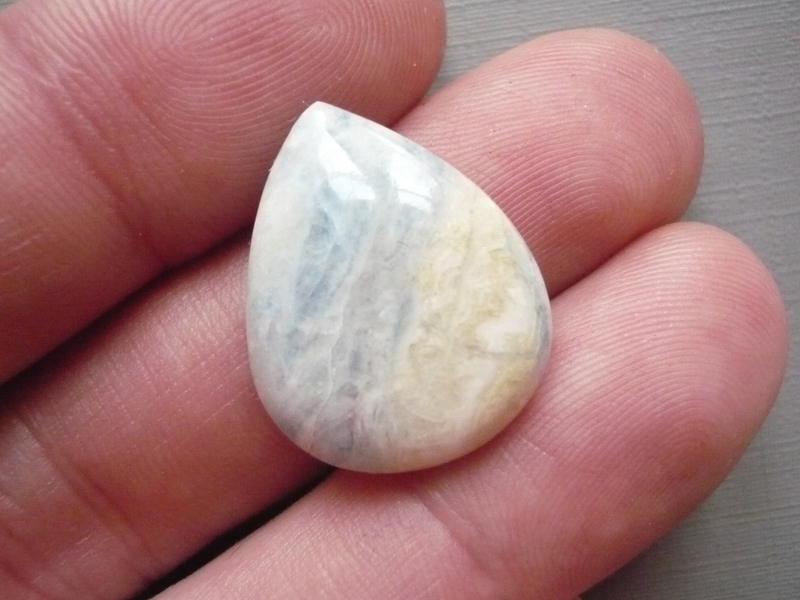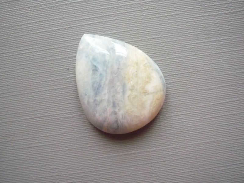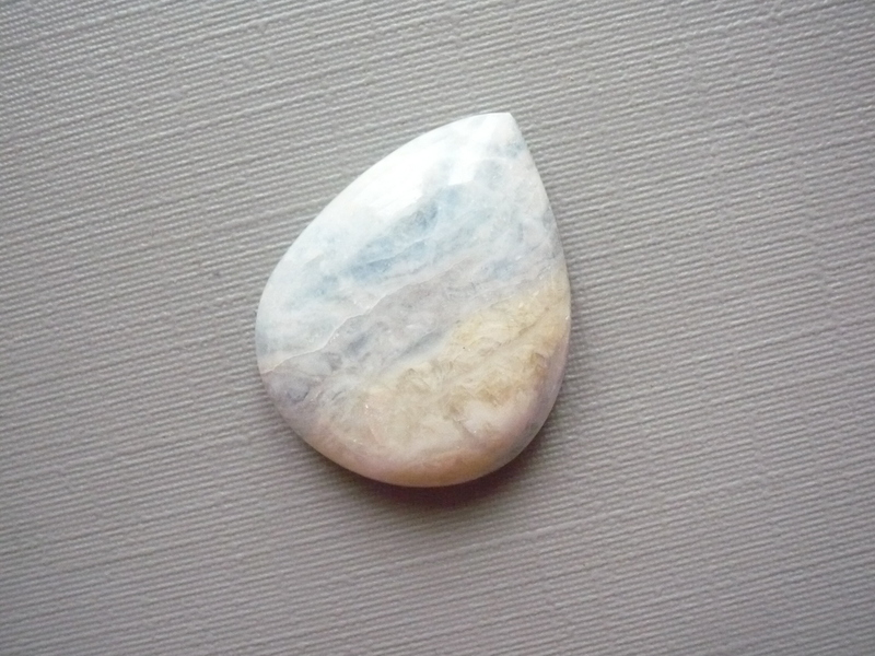 Kabošon - Scheelit modrý. Rozměry 22 x 18 x 6 mm. Vhodné pro cínování, obšívání... Kupujete tento konkrétní kus. Původ Mexiko. Scheelit byl objeven nedávno. Minerál jako takový je znám již delší dobu, ale jeho modrá varianta je známá poměrně krátce. Jeho vzhled připomíná vlnky nebo krajku. Jedná se o rudu wolframu, minerál wolframanu vápenatého. Modrý scheelit sestává z více druhů minerálů - kalcitu, který dodává nezaměnitelnou modrou barvu, scheelitu (tmavě krémové, zlaté nebo žluté části) a modrého dolomitu, který vytváří pruhy, vlnky, krajku.