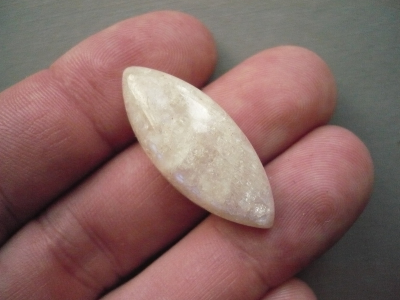 Kabošon měsíčního kamene, top kvalita. Rozměry 33 x 13 x 7 mm. Původ Indie. Vhodné pro cínování, obšívání... Ze spodní strany je plochý. Je mléčně bílý, poloprůhledný s výraznou modrou adularescencí. Jsou výběrové a moc pěkné.