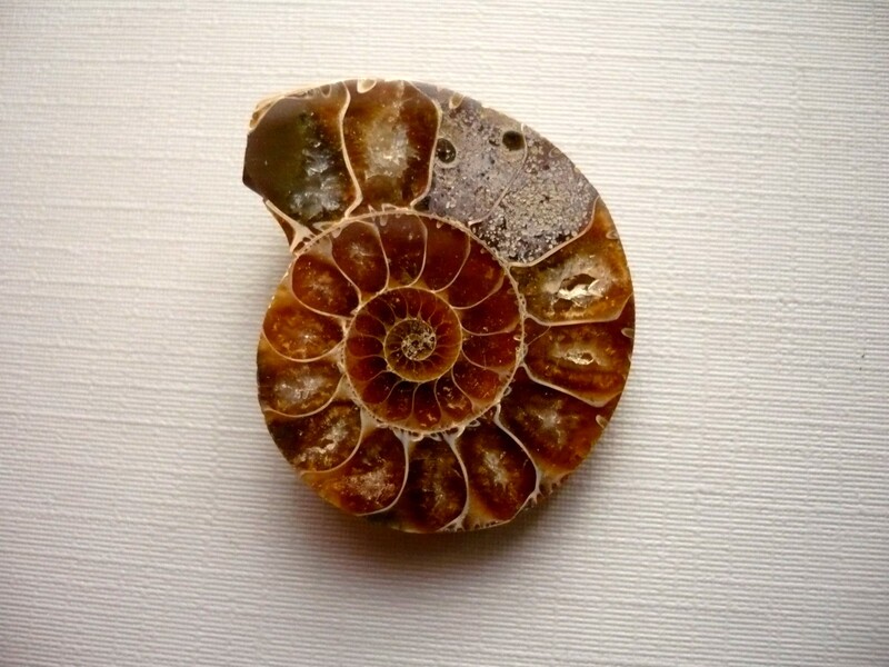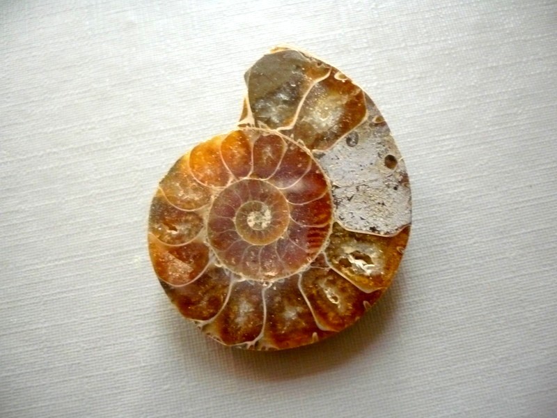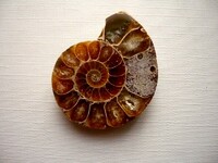 Fosilní amonit - půlka. Vhodné pro sběratele, pro obšívání, cínování... Svrchu leštěný. Rozměry 33 x 27 x 8 mm. Kupujete vyfocený kousek. Původ Madagaskar.