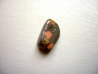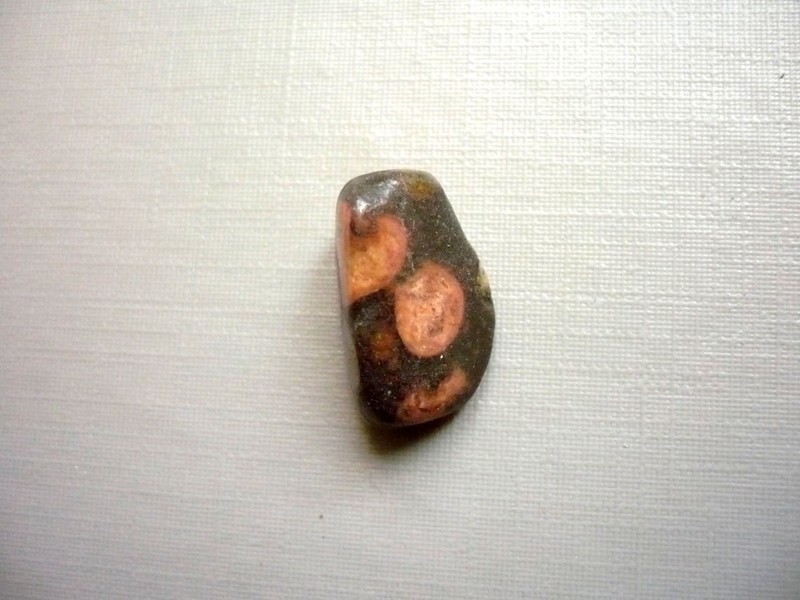 Tromlovaný kámen - melafyr. Rozměry 17 x 10 x 9 mm. Je z období karbonu až triasu. Obsahuje "mandle" - pecky zelené či oranžové barvy, dutinky po plynech vyplnily křemenné polodrahokamy. Původ Čína.