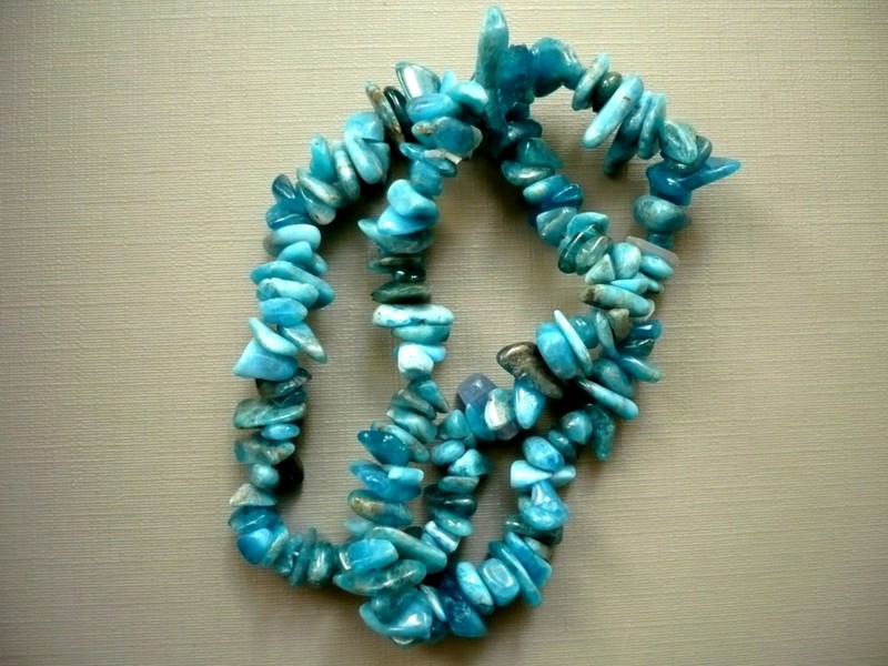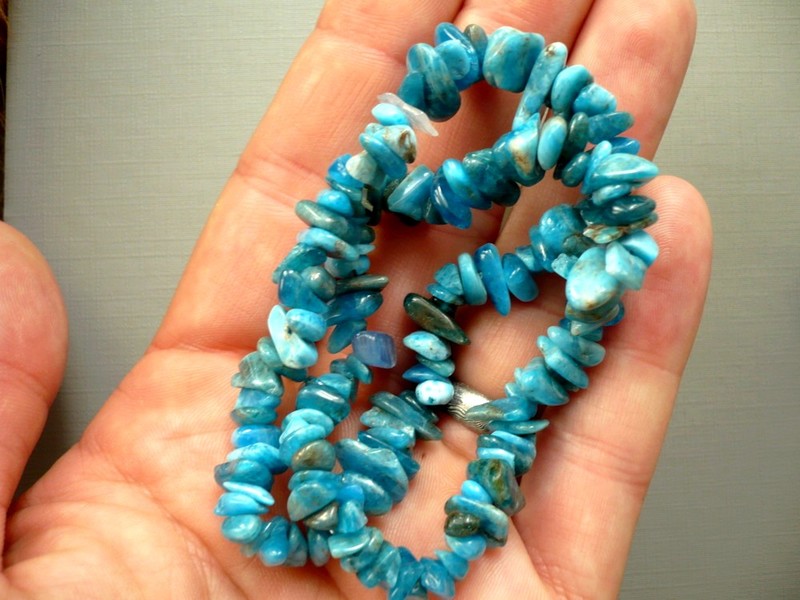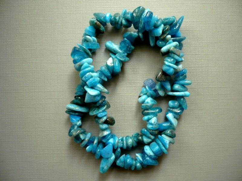 Minerální zlomky apatitu v délce 20 cm, navlečeno na šňůře. Každý zlomek má svou originální kresbu.
