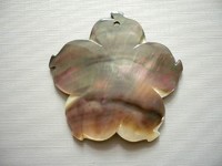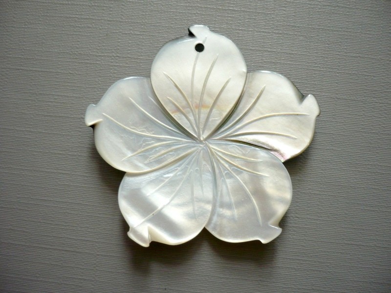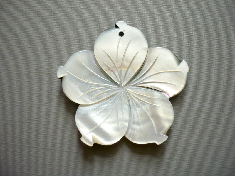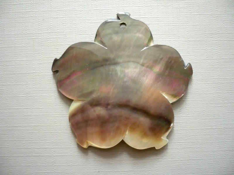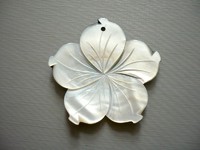 Perleť - přívěšek z perleti, vrtaný. Průměr 49 x 47 x 4 mm, vnitřní dírka 2,5 mm. Kupujete vyfocený kus.