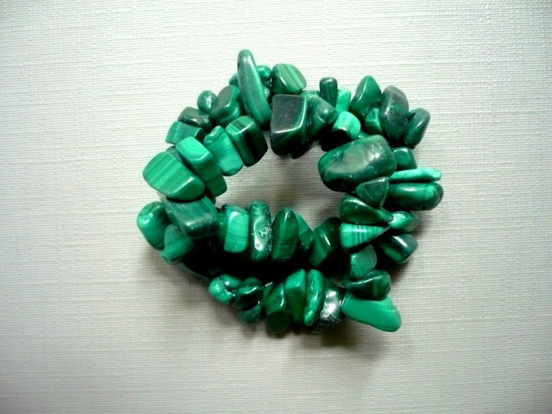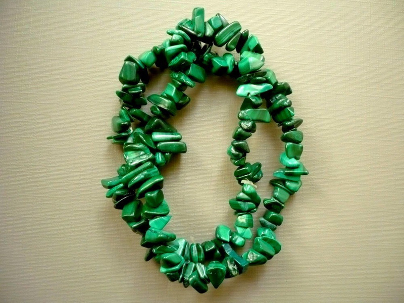 Minerální zlomky - malachit v délce 18 cm, navlečeno na šňůře. Každý zlomek má svou originální kresbu.