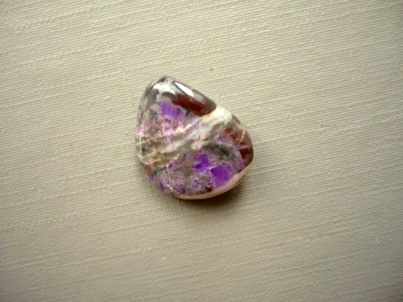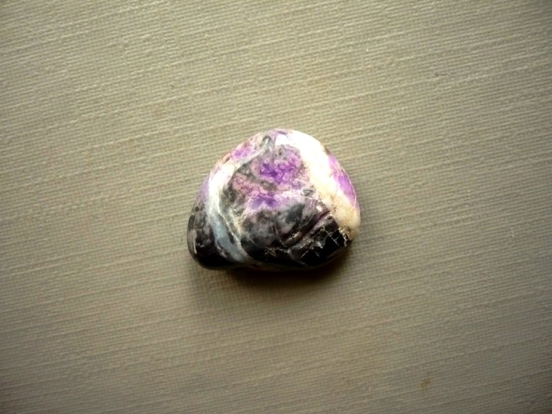 Tromlovaný kámen - sugilit (luvulit). Rozměry 15 x 13 x 5 mm. Původ JAR. Sugilit - byl objeven v jihozápadním Japonsku v roce 1944 profesorem Ken-ichi Sugi, po kterém je pojmenován. V roce 1979 bylo náhodně objeveno velké množství sugilitu drahokamové kvality v manganových dolech v okolí Kurumanu v Jižní Africe, odkud jsouni tyto tromláčky. Sugilit je oblíben zejména pro svoji krásnou fialovou nebo purpurovou barvu a ceněný je pro svoji unikátnost a omezené zdroje.