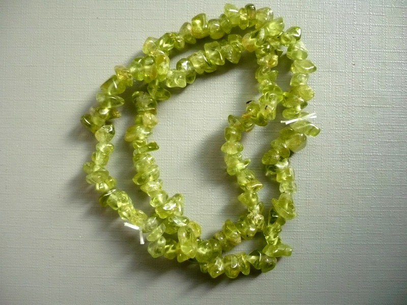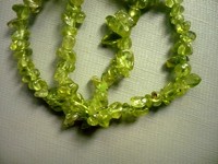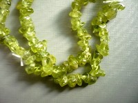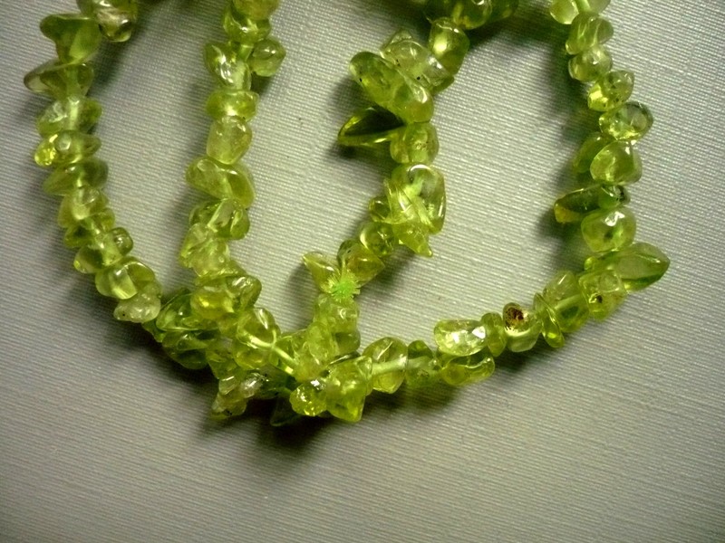 Minerální zlomky - olivín, v délce 19-20 cm. Každý zlomek má svou originální kresbu. Jsou navlečeny na pružence.