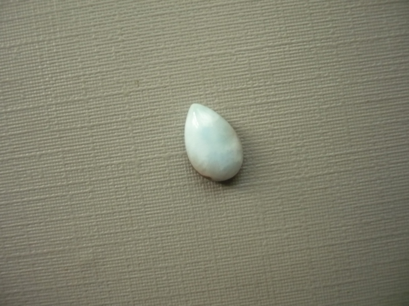 Kabošon - larimar. Rozměry 9 x 6 x 3 mm. Naleziště Dominikánská republika. Patří do skupiny pektolitů, mají krásné modré zbarvení připomínající moře. Larimar - název odvozen od slova "Mare" - moře a začátku jména Larissa, dcery obejvitele Mendeze.