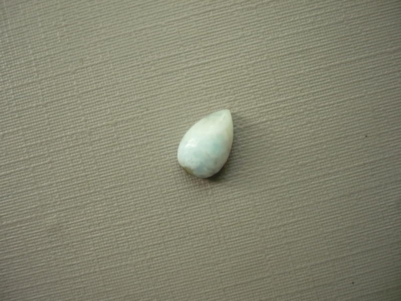 Kabošon - larimar. Rozměry 9 x 6 x 3 mm. Naleziště Dominikánská republika. Patří do skupiny pektolitů, mají krásné modré zbarvení připomínající moře. Larimar - název odvozen od slova "Mare" - moře a začátku jména Larissa, dcery obejvitele Mendeze.