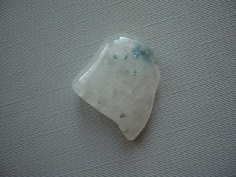 Tromlovaný kámen - aqualite (apatit v křemeni). Rozměry 19 x 19 x 5 mm. Původ Jižní Afrika.