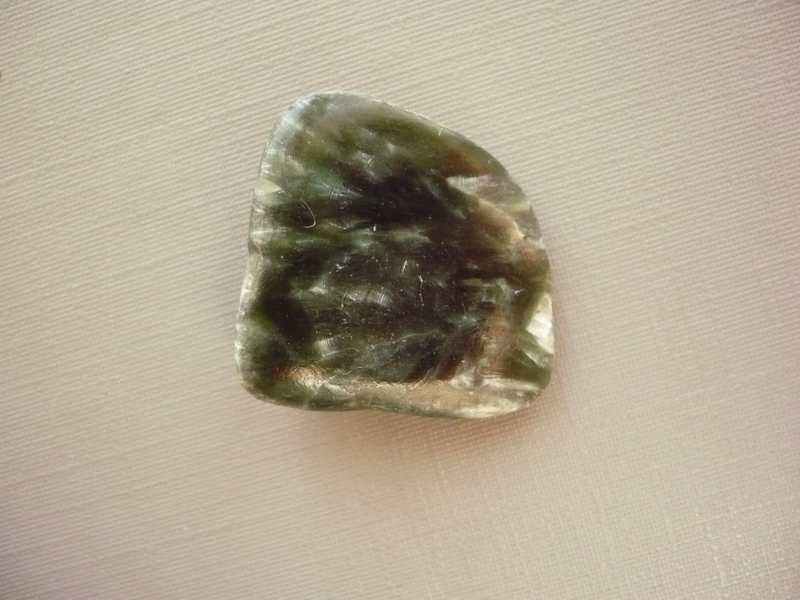 Tromlovaný kámen - serafinit. Rozměry 23 x 22 x 7 mm. Původ Rusko. Také se mu říká "andělská křídla".