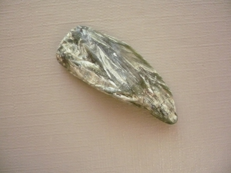 Tromlovaný kámen - serafinit. Rozměry 35 x 15 x 8 mm. Původ Rusko. Také se mu říká "andělská křídla".