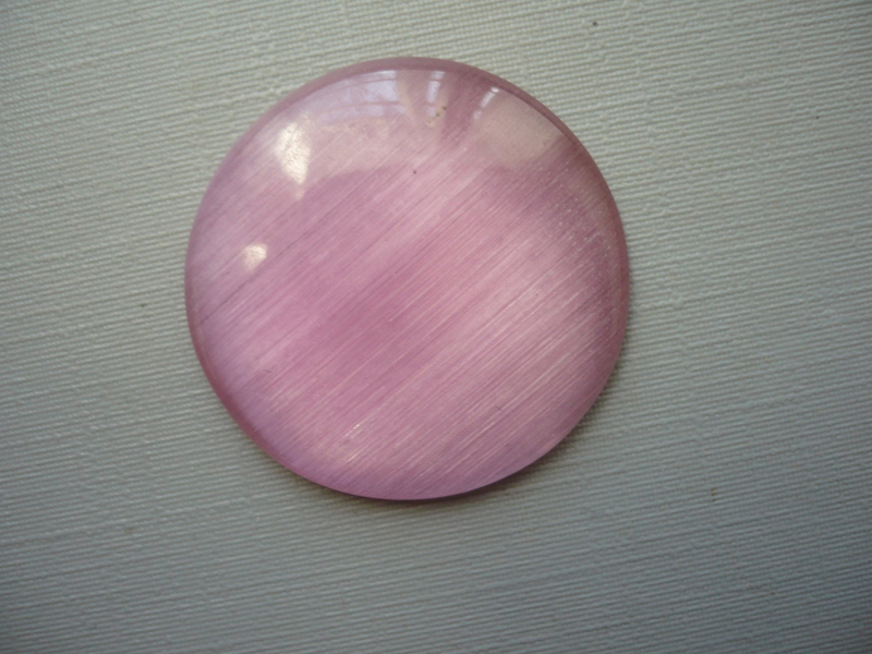Kabošon - kočičí oko (ulexit). Rozměr 29 x 4 mm. Tento kabošon je vlastně sklo, ale velmi efektní. Uvnitř jsou paralelně uspořádané šestiboké kanálky optických vláken, v růžové variantě je velmi něžný.