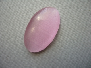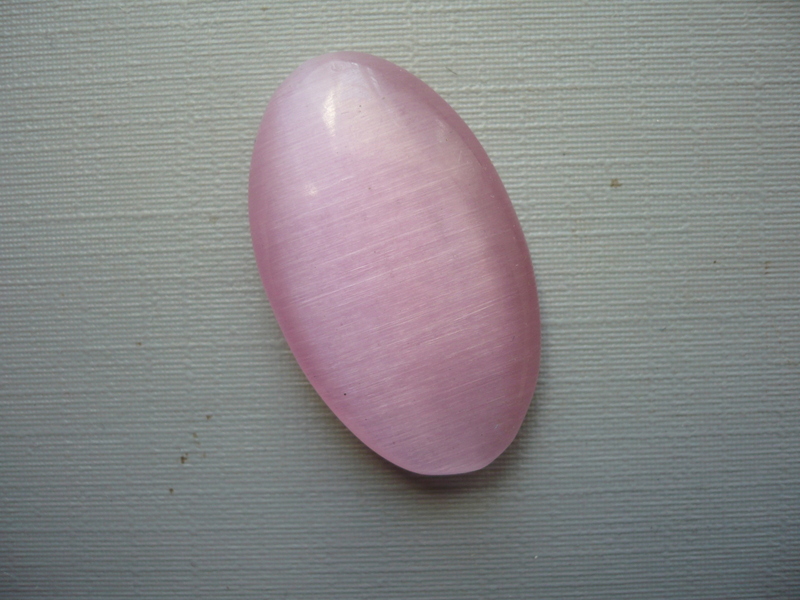 Kabošon - kočičí oko (ulexit). Rozměr 30 x 18 x 6 mm. Tento kabošon je vlastně sklo, ale velmi efektní. Uvnitř jsou paralelně uspořádané šestiboké kanálky optických vláken, v růžové variantě je velmi něžný.