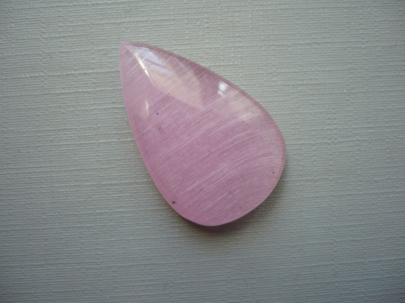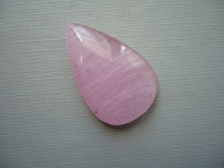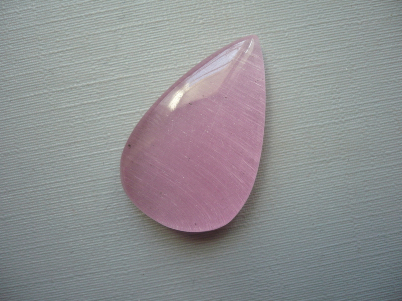 Kabošon - kočičí oko (ulexit). Rozměr 31 x 19 x 6 mm. Tento kabošon je vlastně sklo, ale velmi efektní. Uvnitř jsou paralelně uspořádané šestiboké kanálky optických vláken, v růžové variantě je velmi něžný.