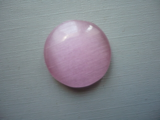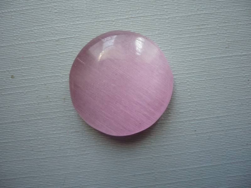 Kabošon - kočičí oko (ulexit). Rozměr 21 x 6 mm. Tento kabošon je vlastně sklo, ale velmi efektní. Uvnitř jsou paralelně uspořádané šestiboké kanálky optických vláken, v růžové variantě je velmi něžný.
