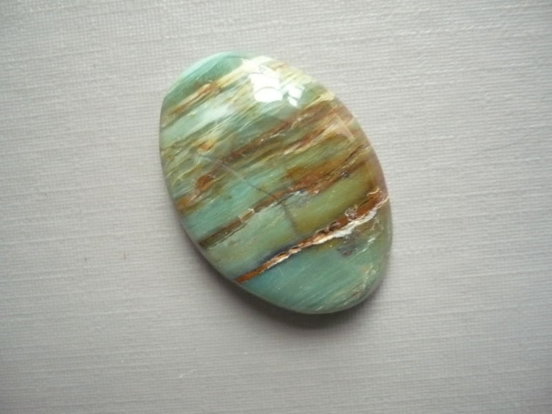 Kabošon - prasem (africký jadeit). Rozměry 26 x 18 x 6 mm. Vhodný pro cínování, wire-wrapping.. Původ Jižní Afrika.