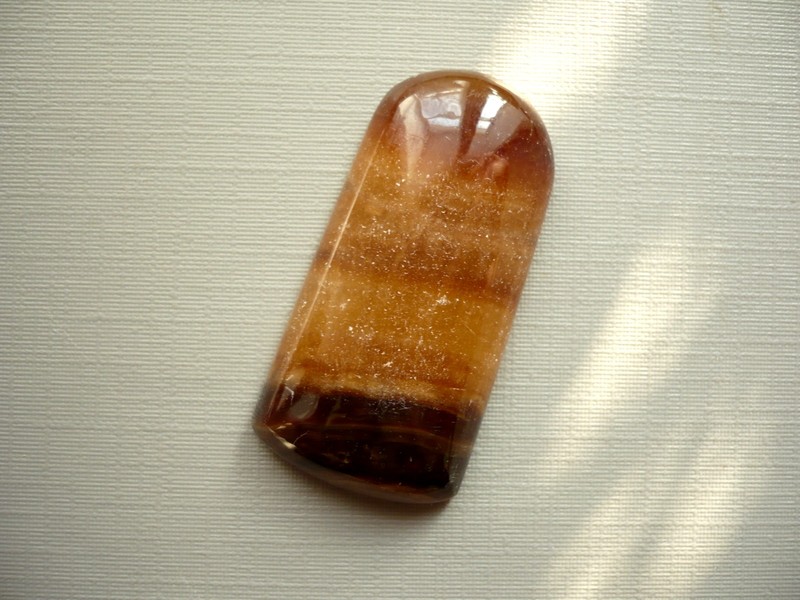 Velký kabošon z hnědého aragonitu výběrové kvality. Rozměry 38 x 19 x 7 mm. Je broušený, leštěný, z jedné strany plochý.