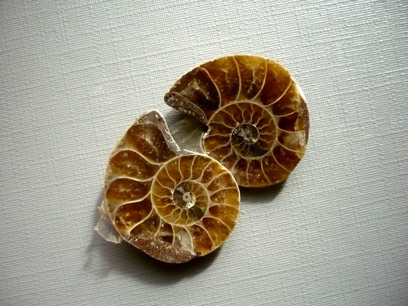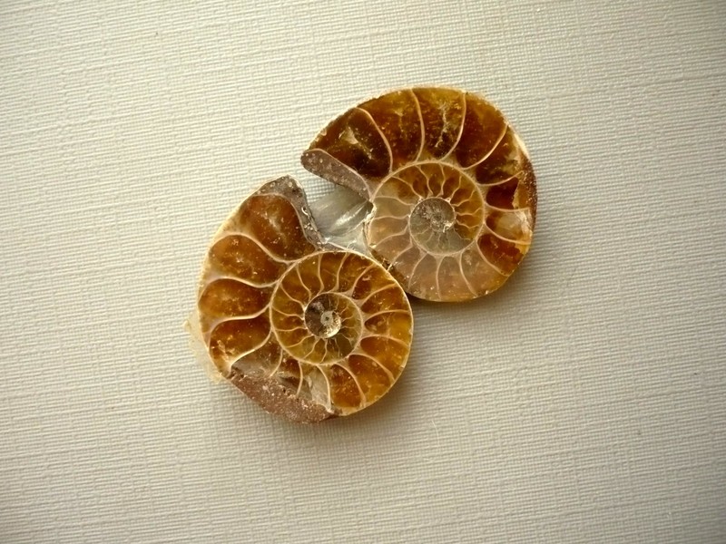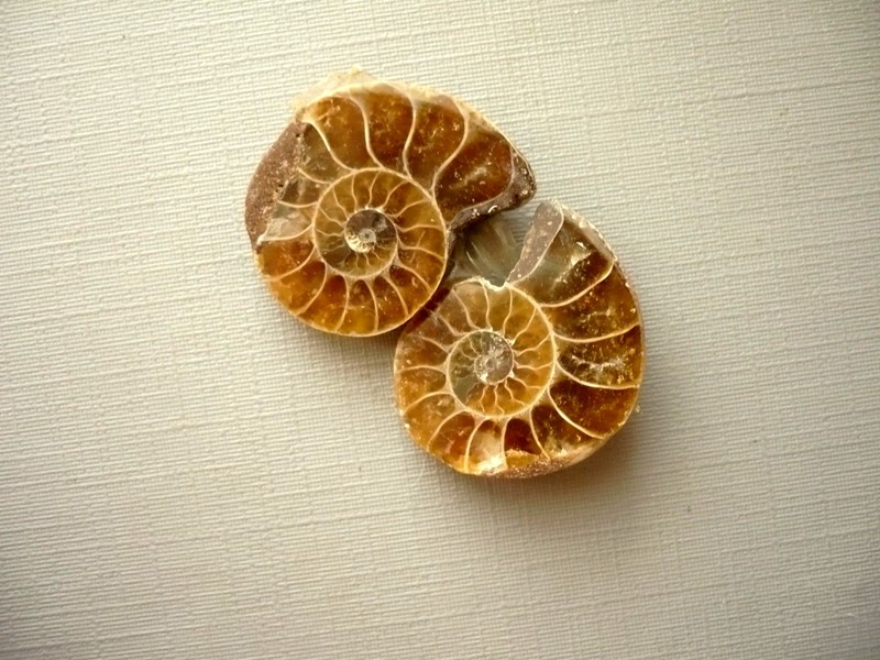Pár amonitů opalizujících - naleziště Madagaskar. Rozměry jedné půlky 23 x 19 x 5 mm. Půlky jsou z jedné strany leštěné. Tento není poničený, jen mu v procesu zkamenění popraskaly přepážky :-) Amonit - je vlastně zkamenělá schránka živočicha, připomíná beraní rohy. Amonitová schránka je uvnitř rozdělena přepážkami na menší komory, do kterých amonit vylučoval plyn. Tento plyn byl důležitý proto, aby se schránka vznášela ve vodě. Tím jak amonit rostl, tím se také zvětšovaly jednotlivé komory na otevřeném konci. Amonity však vysycháním starověkých moří postupně vymíraly a jejich schránky byly pohlceny v metamorfovaných kamenných masách.
