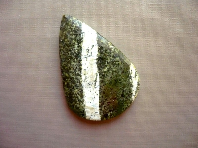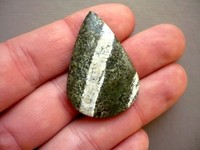 Nevrtaný tvar - kabošon serpentinitu (chrysotil). Rozměry 39 x 26 x 5 mm. Vhodné pro cínování, obšívání... Chrysotil - vzniká metamorfózou olivínu a pyroxenů, patří do skupiny serpentinitů. Vyniká pruhovanou strukturou (vláknité agregáty).