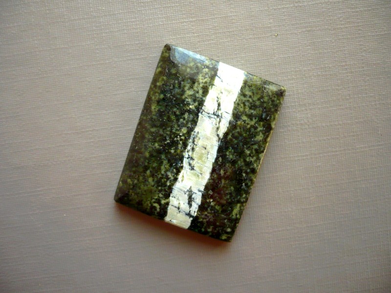 Nevrtaný tvar - kabošon serpentinitu (chrysotil). Rozměry 29 x 22 x 5 mm. Vhodné pro cínování, obšívání... Chrysotil - vzniká metamorfózou olivínu a pyroxenů, patří do skupiny serpentinitů. Vyniká pruhovanou strukturou (vláknité agregáty).