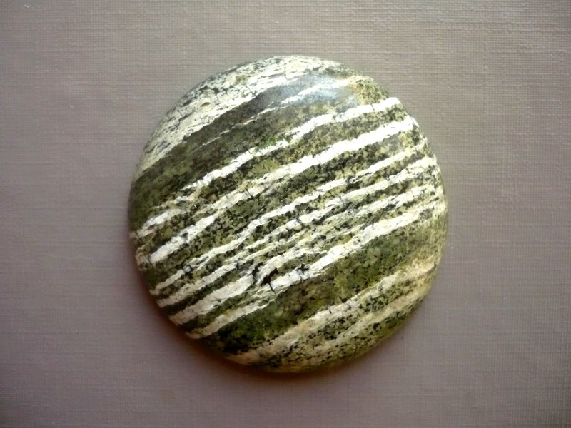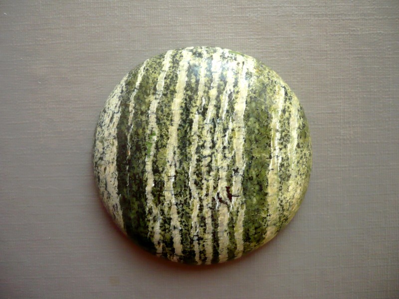 Nevrtaný tvar - kabošon serpentinitu (chrysotil). Rozměry 43 x 9 mm. Vhodné pro cínování, obšívání... Chrysotil - vzniká metamorfózou olivínu a pyroxenů, patří do skupiny serpentinitů. Vyniká pruhovanou strukturou (vláknité agregáty).