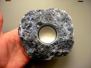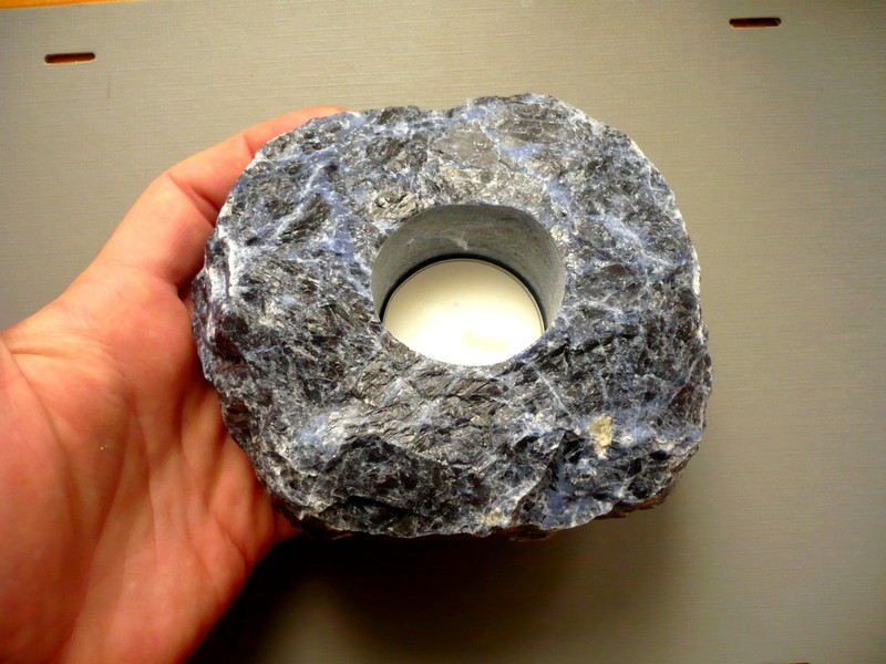 Krásný svícen z modrého sodalitu, má zbroušenou spodní stranu, má nožičky proti oděru nábytku. Má vyfrézovanou díru pro čajovou svíčku. Kupujete vyfocený kousek. Rozměry 119 x 102 x 55 mm. Původ Brazílie.