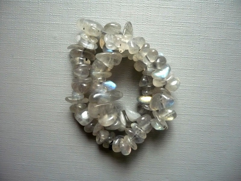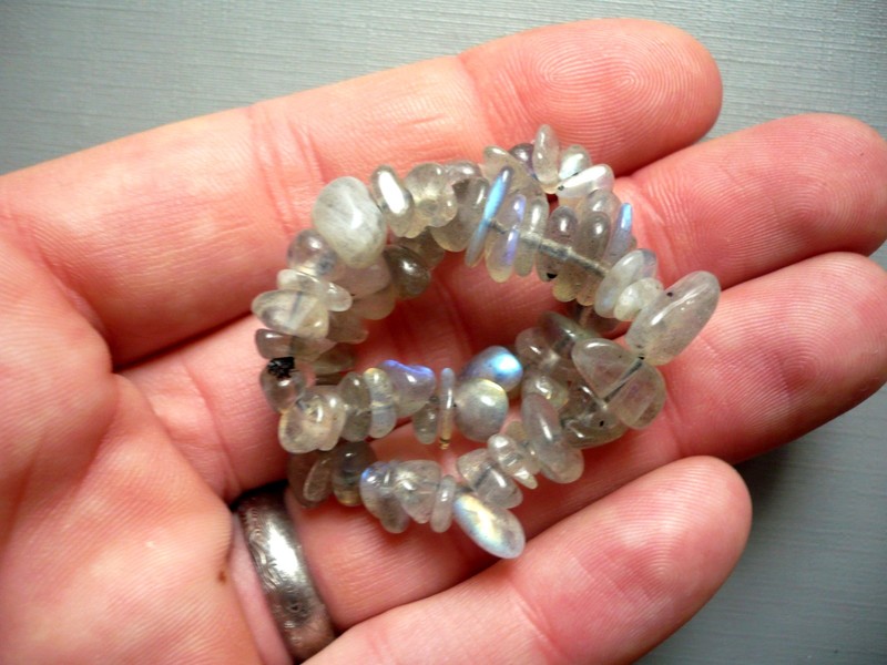Minerální zlomky labradorit kulatý s krásnou labradorizací, v délce 18 cm, navlečeno na pružence. Každý zlomek má svou originální kresbu. V nabídce jsou ještě zlomky 45 a 90 cm, placky a troml. kameny, přívěšky..