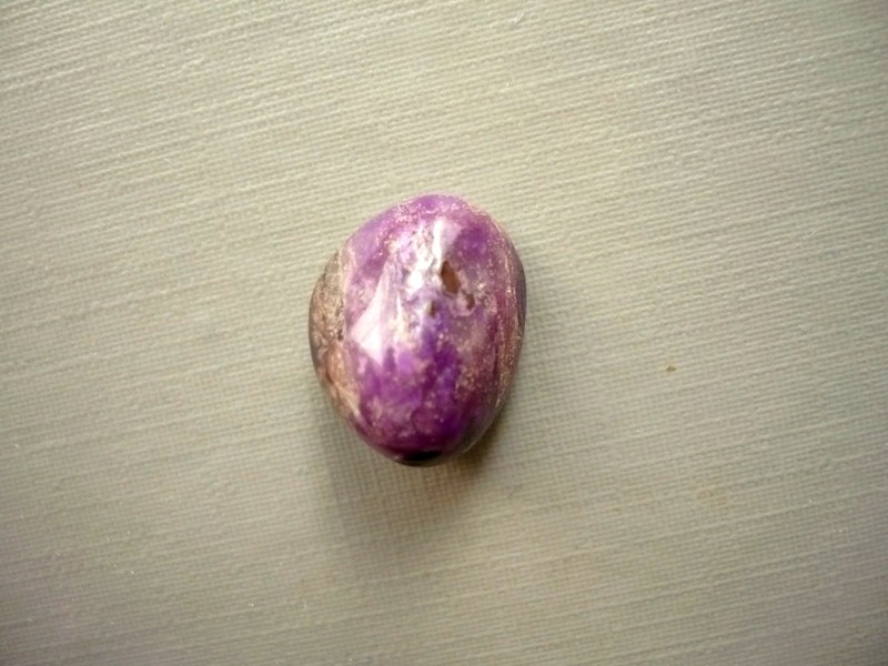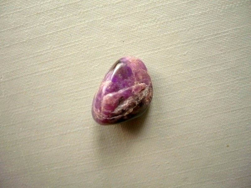 Tromlovaný kámen - sugilit (luvulit). Rozměry 15 x 12 x 9 mm. Původ JAR. Sugilit - byl objeven v jihozápadním Japonsku v roce 1944 profesorem Ken-ichi Sugi, po kterém je pojmenován. V roce 1979 bylo náhodně objeveno velké množství sugilitu drahokamové kvality v manganových dolech v okolí Kurumanu v Jižní Africe, odkud jsouni tyto tromláčky. Sugilit je oblíben zejména pro svoji krásnou fialovou nebo purpurovou barvu a ceněný je pro svoji unikátnost a omezené zdroje.