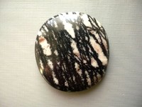 Tromlovaná placka - jaspis písmenkový. Rozměry 43 x 40 x 9 mm. Kupujete vyfocený kousek. Leštěné. Vhodné pro cínování, obšívání, wire-wrapping..