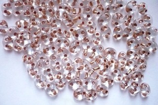 Rokajlové korálky české výroby - dvoudírkový rokajl = twin Preciosa Jablonex. Rozměry 5 x 3,5 x 2,5 mm. Barva čirá s čajovým průtahem. Cena za 10 gramů (cca 180 ks). T21
