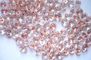 Rokajlové korálky české výroby - dvoudírkový rokajl = twin Preciosa Jablonex. Rozměry 5 x 3,5 x 2,5 mm. Barva čirá s lososovým průtahem. Cena za 10 gramů (cca 180 ks). T20