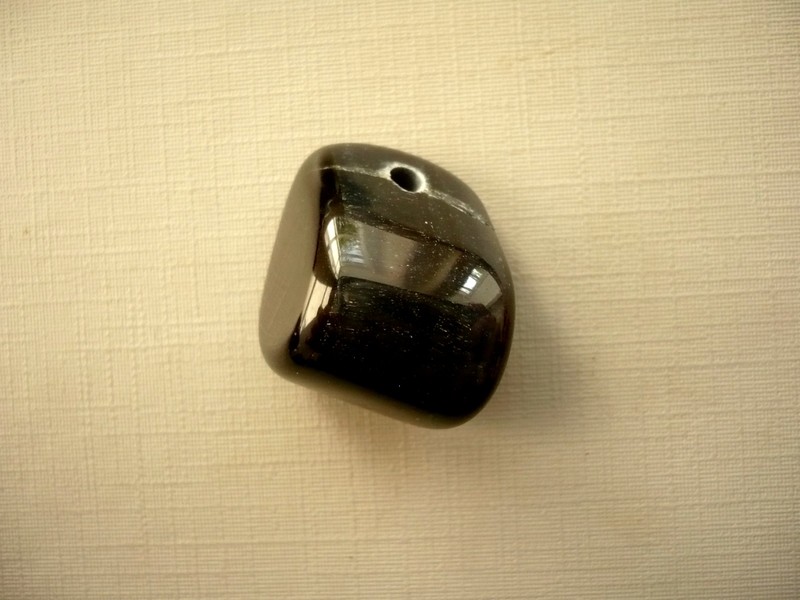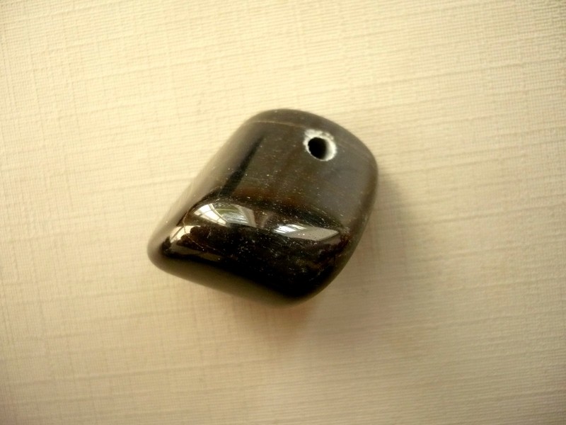 Vrtaný kámen - sokolí oko. Kupujete vyfocený kus. Rozměry 25 x 17 x 15 mm. Vrtaná dírka má průměr 2,8 mm.