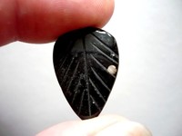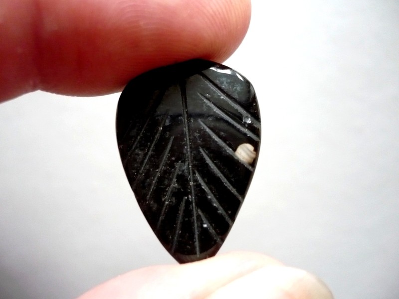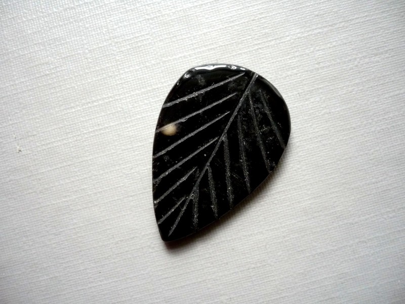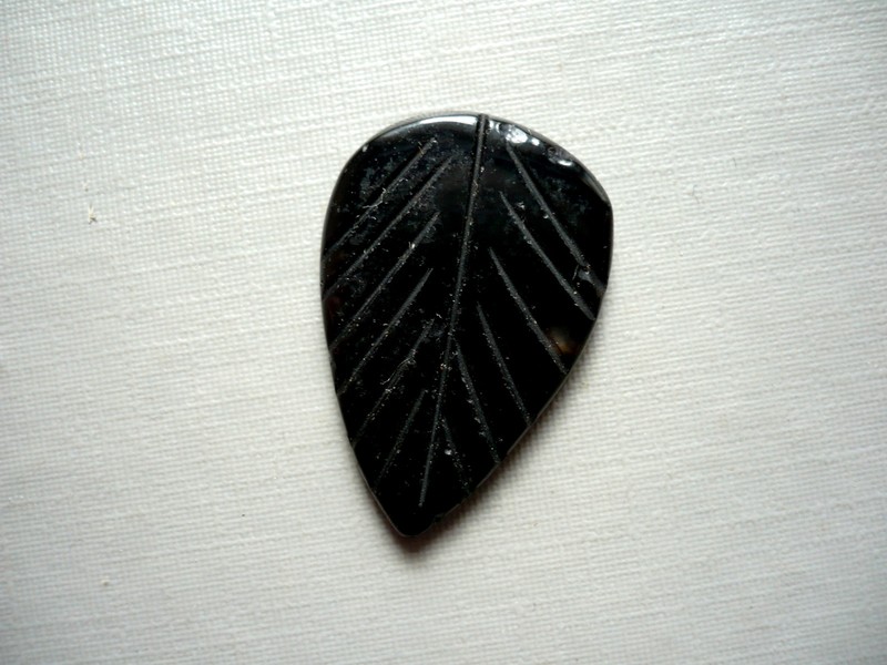 Kabošon onyxu, lístek s žilkováním. Rozměry 26 x 17 x 3 mm. Původ Brazílie. Vhodné pro cínování, obšívání... Kupujete tento konkrétní kus.