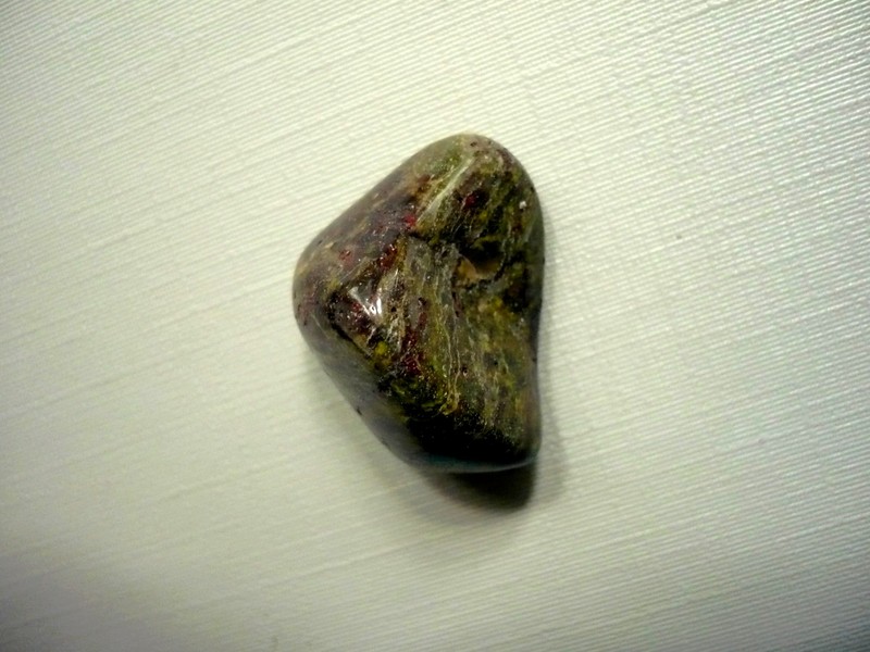 Tromlovaný kámen - epidot s červeným jaspisem. Rozměry 24 x 19 x 15 mm. Také se mu říká Dračí krev. Původ Jižní Afrika.