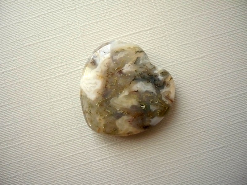 Nevrtané 3D srdíčko - achát mechový. Rozměry 20 x 20 x 5 mm. Kupujete vyfocený kousek. Leštěné. Původ Madagaskar. Toto má vrt. dírku na šlupnu.