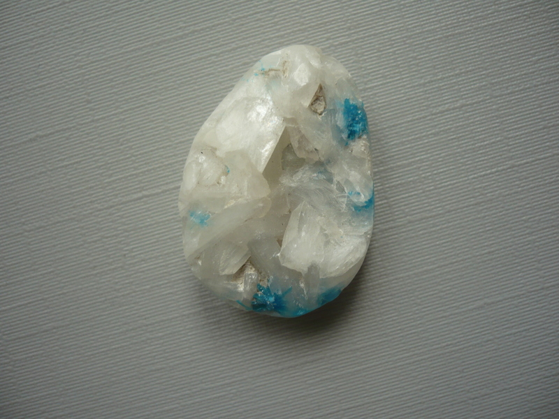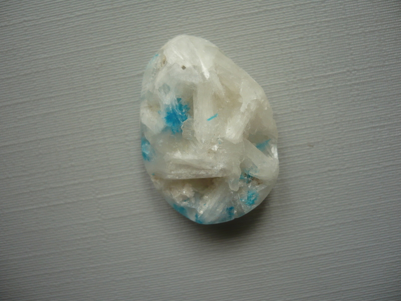 Cavansit ve skolecitu. Rozměr 27 x 19 x 9 mm. Vhodné do cínu, pro wire-wrapping.. Původ Indie. Bílý je skolecit, modré krystaly jsou cavansit.