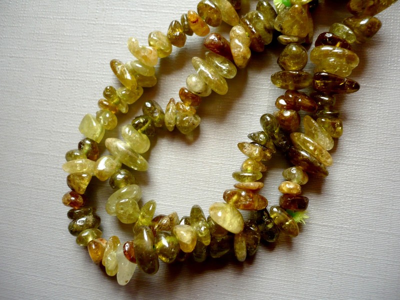 Minerální zlomky zeleného granátu v délce 18-20 cm, navlečeno na pružné šňůře. Každý zlomek má svou originální kresbu. Vhodné k Vašemu dalšímu tvoření.