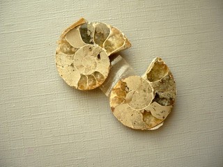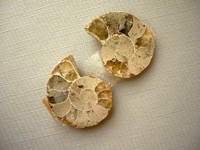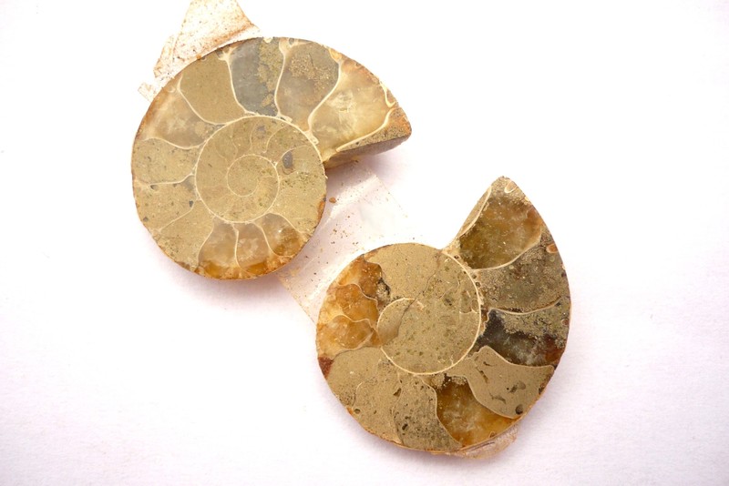 Pár amonitů - naleziště Madagaskar. Rozměry jedné půlky 24 x 19 x 5 mm. Půlky jsou z jedné strany leštěné. Amonit - je vlastně zkamenělá schránka živočicha, připomíná beraní rohy. Amonitová schránka je uvnitř rozdělena přepážkami na menší komory, do kterých amonit vylučoval plyn. Tento plyn byl důležitý proto, aby se schránka vznášela ve vodě. Tím jak amonit rostl, tím se také zvětšovaly jednotlivé komory na otevřeném konci. Amonity však vysycháním starověkých moří postupně vymíraly a jejich schránky byly pohlceny v metamorfovaných kamenných masách.