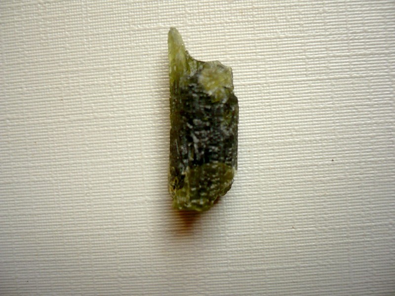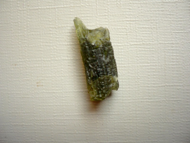 Šperkový kámen - vltavín (moldavit). Váha 1,40 g, rozměry 21 x 8 x 8 mm. Původ Jižní Čechy, různé lokality. Vltavíny - používaly se odedávna jako amulety a talismany, nosily se pro štěstí a plodnost.