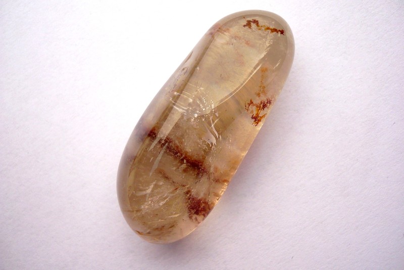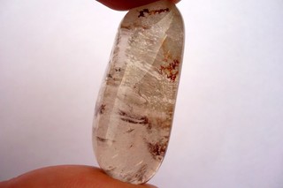 Tromlovaný kámen - křišťál fantom. Rozměry 41 x 17 x 16 mm. Obsahuje inkluze chloridu, chromu a různé fantomy.