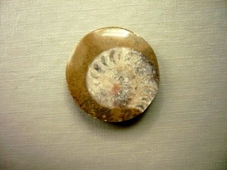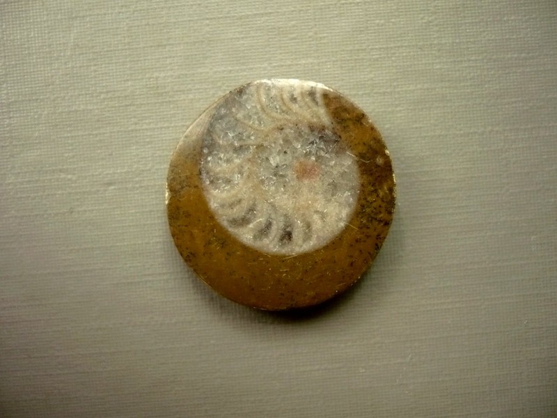 Amonit v matečné hornině - prvohorní fosílie, nevrtaný. Je leštěný svrchu, zespodu plochý, původ Maroko. Rozměry 23 x 23 x 5 mm. Vhodný do šperků, cínu, pro obšívání.