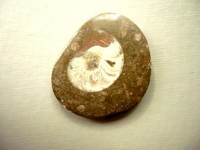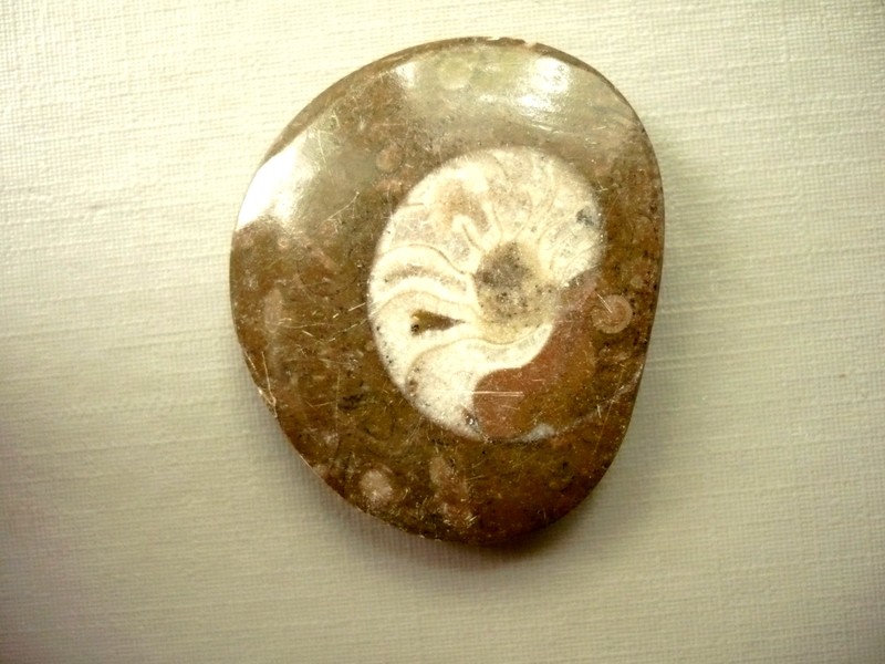 Amonit v matečné hornině - prvohorní fosílie, nevrtaný. Je leštěný svrchu, zespodu plochý, původ Maroko. Rozměry 35 x 29 x 6 mm. Vhodný do šperků, cínu, pro obšívání.
