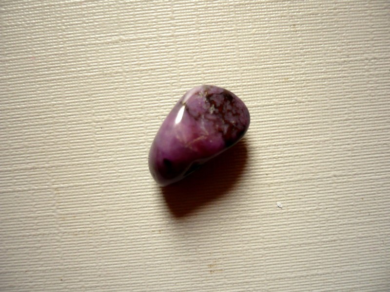Tromlovaný kámen - sugilit (luvulit). Rozměry 14 x 8 x 8 mm. Původ JAR. Sugilit - byl objeven v jihozápadním Japonsku v roce 1944 profesorem Ken-ichi Sugi, po kterém je pojmenován. V roce 1979 bylo náhodně objeveno velké množství sugilitu drahokamové kvality v manganových dolech v okolí Kurumanu v Jižní Africe, odkud jsouni tyto tromláčky. Sugilit je oblíben zejména pro svoji krásnou fialovou nebo purpurovou barvu a ceněný je pro svoji unikátnost a omezené zdroje.