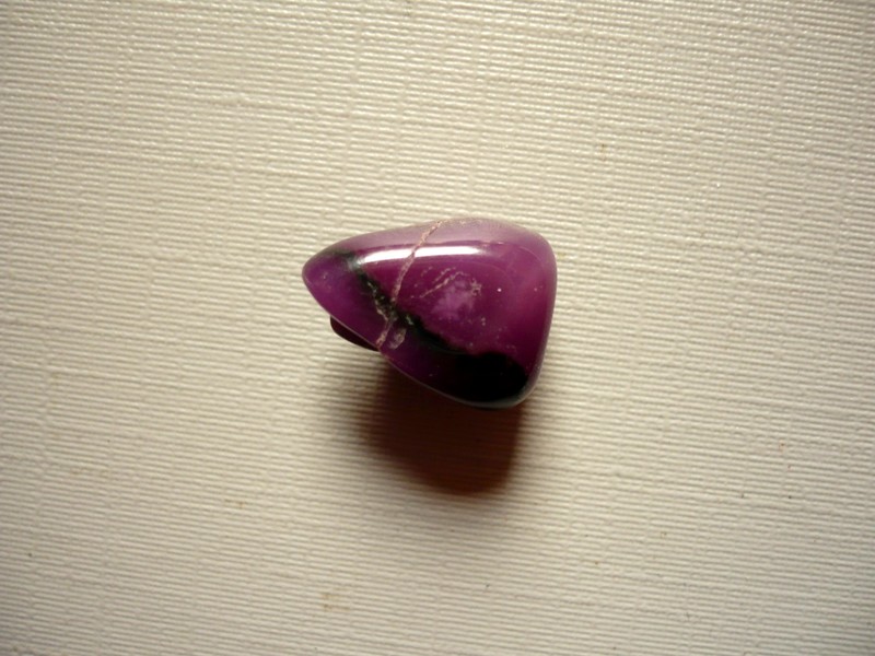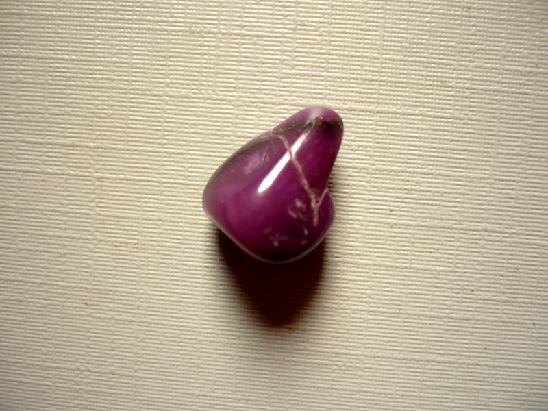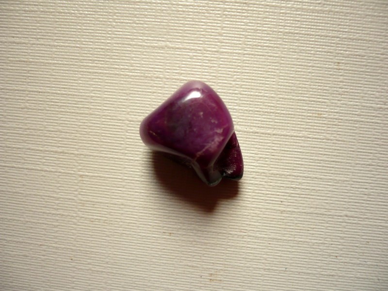 Tromlovaný kámen - sugilit (luvulit). Rozměry 14 x 10 x 8 mm. Původ JAR. Sugilit - byl objeven v jihozápadním Japonsku v roce 1944 profesorem Ken-ichi Sugi, po kterém je pojmenován. V roce 1979 bylo náhodně objeveno velké množství sugilitu drahokamové kvality v manganových dolech v okolí Kurumanu v Jižní Africe, odkud jsouni tyto tromláčky. Sugilit je oblíben zejména pro svoji krásnou fialovou nebo purpurovou barvu a ceněný je pro svoji unikátnost a omezené zdroje.