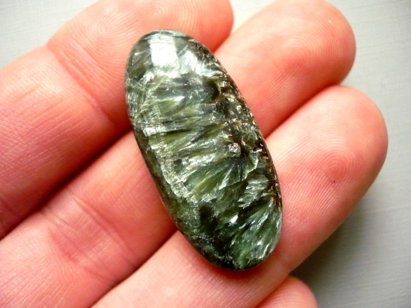 Luxusní kabošon serafinitu. Rozměry 34 x 16 x 6 mm. Původ Rusko. Vhodné pro cínování, obšívání... Ze spodní strany je plochý.